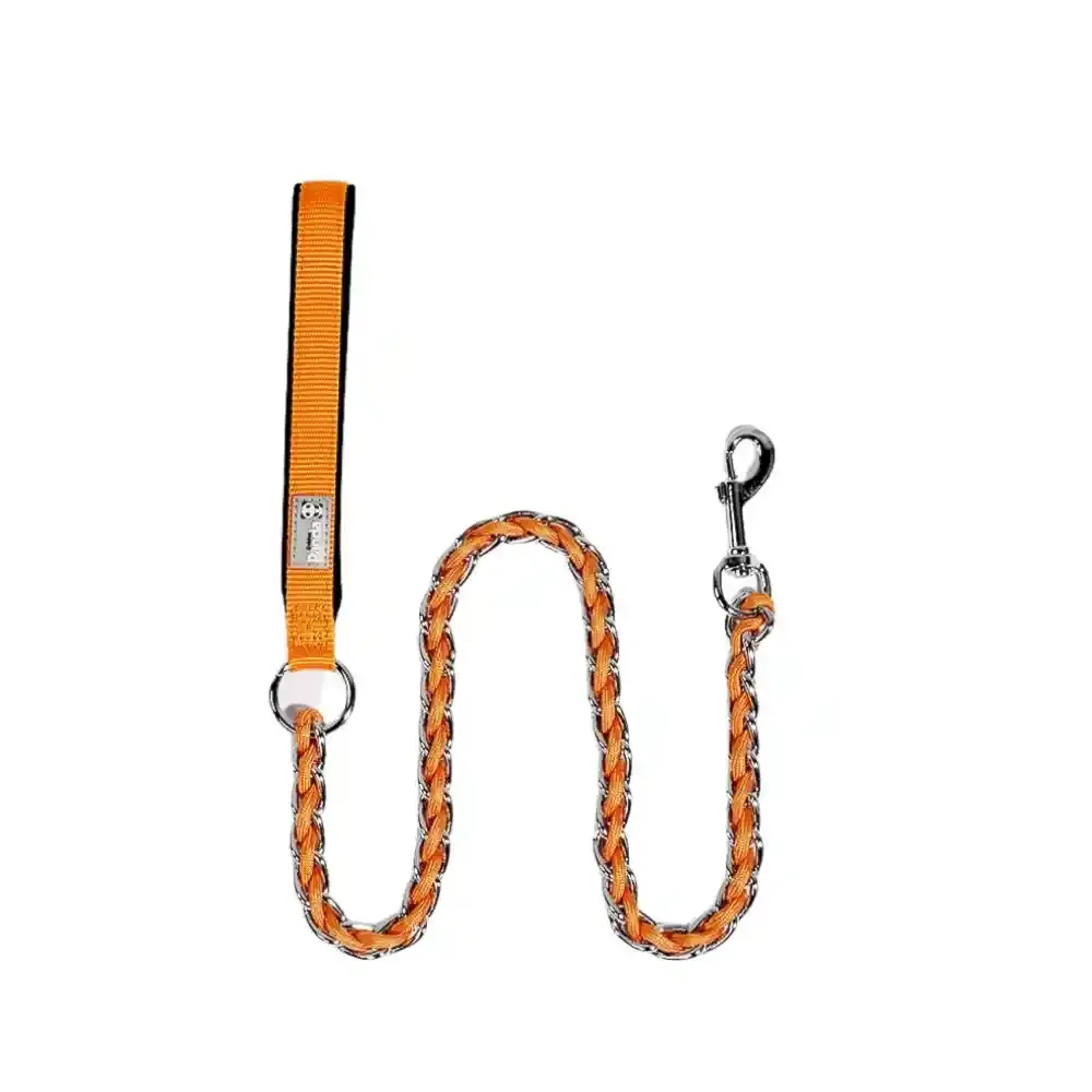 - Stylish and Eye-catching Design: The vibrant orange color and the unique combination of braided fabric and metal chain give this leash and collar a fashionable and distinctive look. The dogs will stand out in the crowd with this stylish accessory.