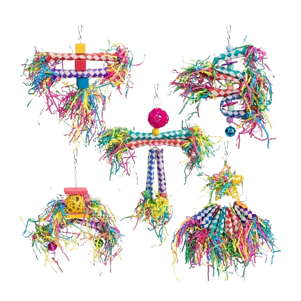 1. Variety of Types: This set includes five distinct types of colorful bird shredding toys, each designed to suit small and medium-sized birds, including parakeets, conures, cockatiels, lovebirds, and similar species.