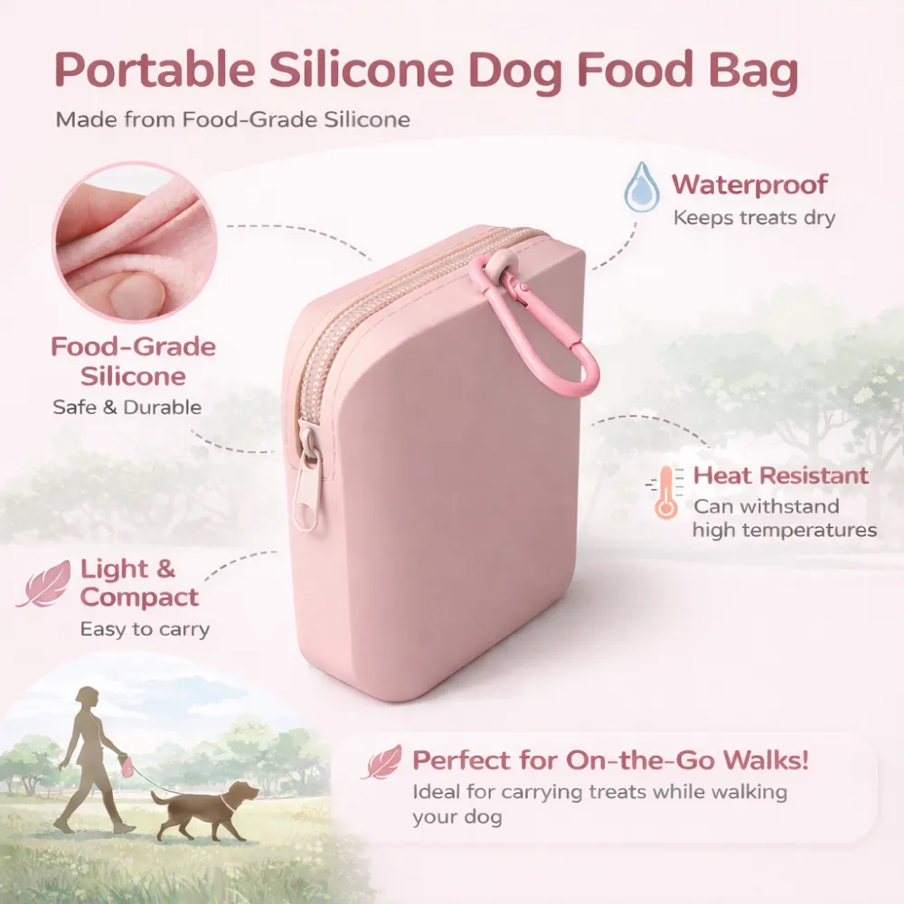 4.Compact & Lightweight: Designed to be portable and easy to carry, this silicone dog food bag is lightweight, compact, and can be clipped onto a belt or packed in a backpack, making it a hassle-free accessory for pet owners and trainers.
